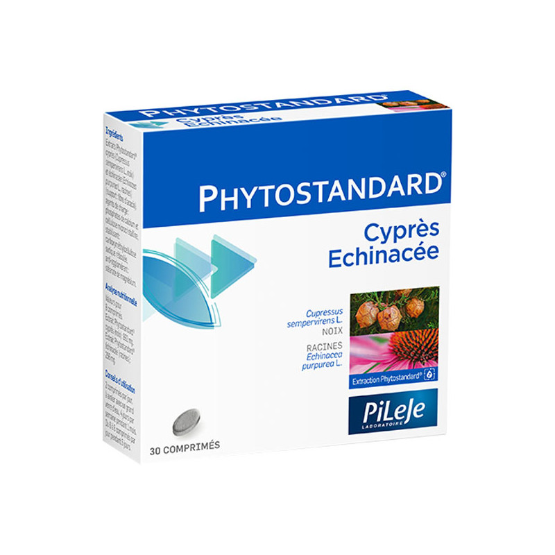 Extraits Phytostandard Cyprès (Cupressus Sempervirens L., Noix) Et Échinacée (Echinacea Purpurea L., Racines) (Support : Fibre D’acacia), Agent de Charge : Cellulose Microcristalline, Stabilisant : Carboxyméthylcellulose de Sodium Réticulée, Anti-agglomérant : Sels de Magnésium d'acides Gras.