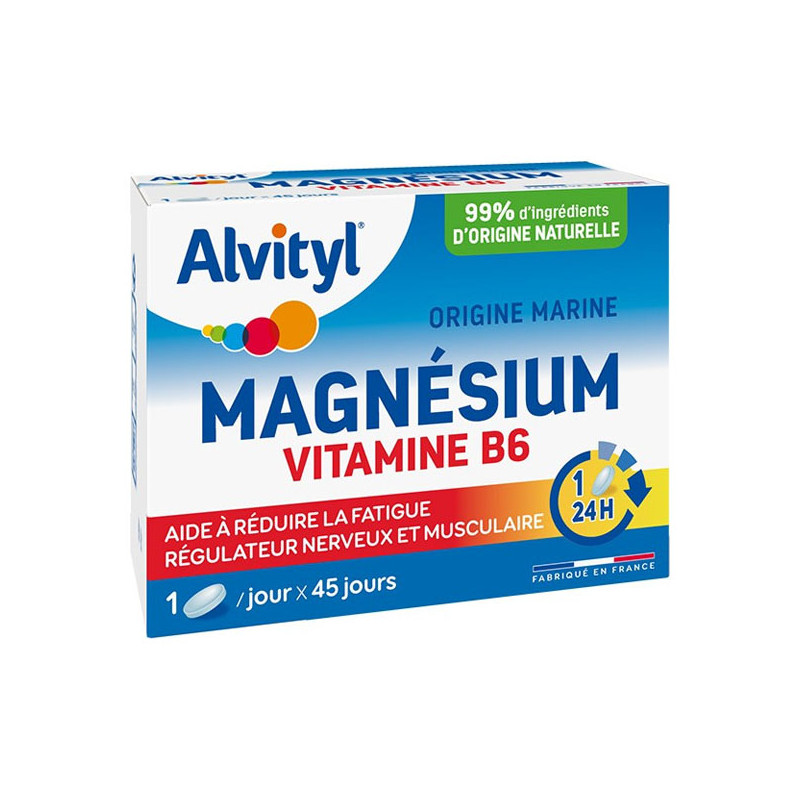Alvityl Magnésium Vitamine B6 apporte en 1 seul comprimé par jour la quantité de magnésium (origine marine) et vitamine B6 afin d’aider à réduire la fatigue et contribuer à maintenir une fonction psychologique normale.
