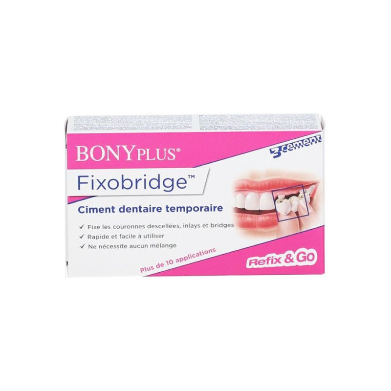 Fixobridge est un ciment prêt à l’emploi qui permet de refixer temporairement les bridges dentaires, les couronnes provisoires et les couronnes en métal, en porcelaine et en acrylique.