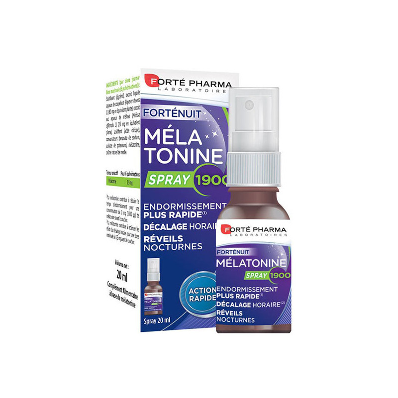 Le spray FortéNuit Mélatonine 1900 associe de la mélatonine à un dosage fort de 1,9 mg et des plantes pour favoriser un endormissement plus rapide et vous aider à bien dormir toute la nuit !